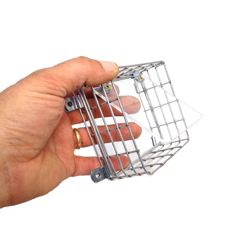 It is constructed of 1/2″ x 1″ – 14ga galvanized wire mesh and 1/8″ thick clear acrylic.