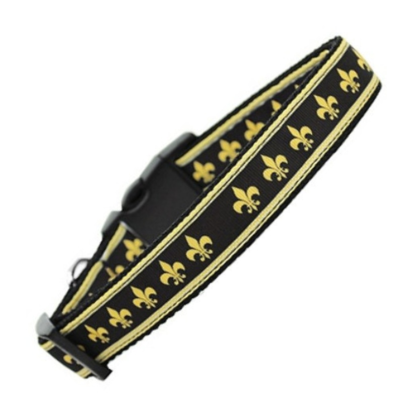Black And Gold Fleur De Lis Nylon Dog & Cat Collar Get Yours Now! This fashionable, durable nylon ribbon dog or cat collar is sure to make your pet the talk of the neighborhood! Made from military-grade nylon with a high-quality ribbon stitched on top, it'