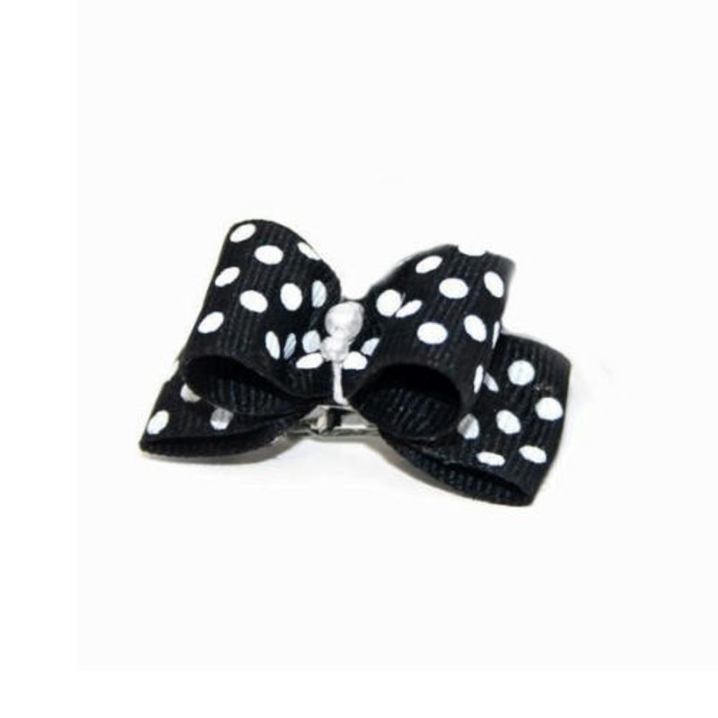 Black Mini Polka Dot Pet BarretteJet beads are hand sewn onto a classic grosgrain bow. Just like the literary character of Gatsby, this bow is both decadent and divine!French ClipSize: 1 3/4" x 3/4". Suggested for pets 18 lbs+