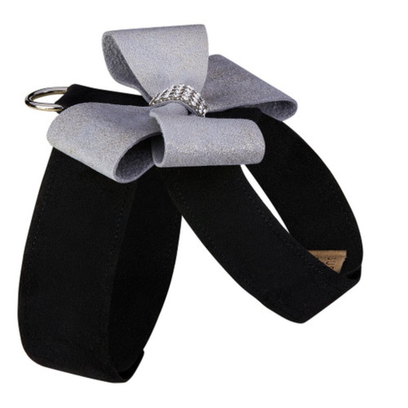 Black Tinkie Harness with Platinum Glitzerati Nouveau Bowby Susan Lanci Design Your pup will sparkle in this adorable lightweight Nouveau Bow Tinkie Dog Harness shown with a Platinum Glitzerati Nouveau Bow, you can customize the harness color and it is sur