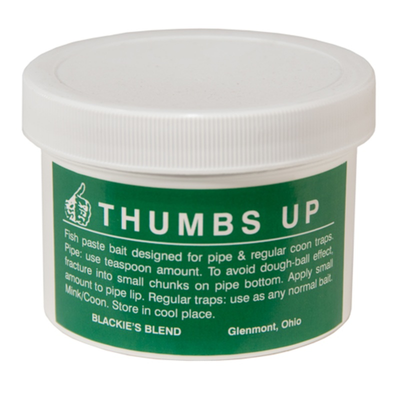 Thumbs Up (Fish Paste Bait) - Thumb's Up is Blackie's top mink/coon bait for the early season. Fresh fish is at the top of the list for mink/coon early to mid-season. This heavy paste is laced with bold side odors and top tones to carry and penetrate. A lo