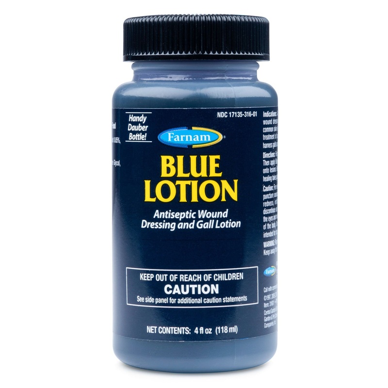 Blue LotionA quick-drying, deep-penetrating antiseptic wound dressing and gall lotion to aid in the treatment of surface wounds, minor cuts and abrasions, harness galls and saddle sores. Blue Lotion is also effective against most common skin bacterial infe