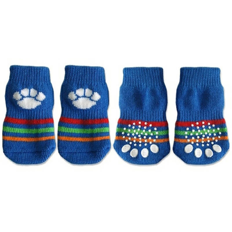 Blue with White Paw Doggy SocksFeatures non-skid pads. Double cinching for secure fit. Keep your dogs paws warm in cold weather. Skid free pads help prevent sliding on slippery surfaces. Can be used for in-between shoe or boot sizes to provide a better fit