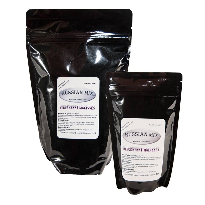 Boarmasters Russian Mix hog feeder additive is a favorite for wild hogs. Developed and tested on our 5,000 acres, Not only did it perform its purpose; we noticed a 50% increase in daytime feedings. Works great in feeders as well! Available in 4oz and 1 lb.