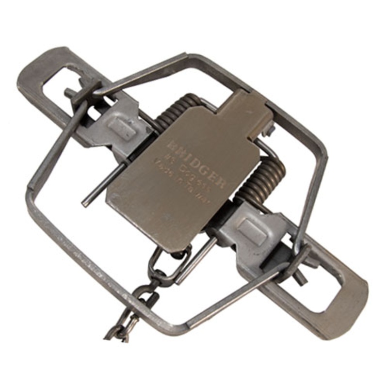 The #3 Bridger Dogless Offset Jaws Coil Spring Trap has a 6 1/16" inside jaw spread and a 6 7/16" outside jaw spread. This trap features a heavy duty over-sized pan, base plate with center located D-Ring, high quality chain, heavy duty swivels and fully ad