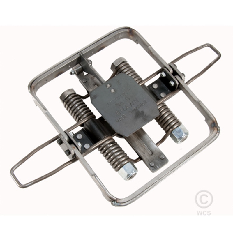 The Brawn #9 has a 9 1/8″ outside jaw spread and comes in two models; 7/16″ offset laminated jaws or with rubber padded jaws. The traps unique spring design incorporates an acceleration ramp to speed the jaws up. The Brawn is built like a tank and the jaws lay very flat. It has an adjustable dogless pan design along with four very heavy coil springs. The trap is center swiveled with an extra heavy duty D-ring. An excellent choice for wolves and lions.
