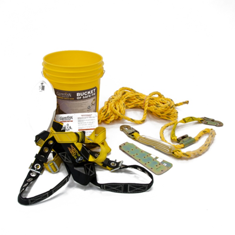 The Bucket of Safe-Tie from Guardian fall Protection is a convenient kit with everything you need to stay safe while working at heights. Each bucket contains a Guardian Velocity Harness, 50' of lanyard with built-in shock absorber, and a Temper Roof Anchor