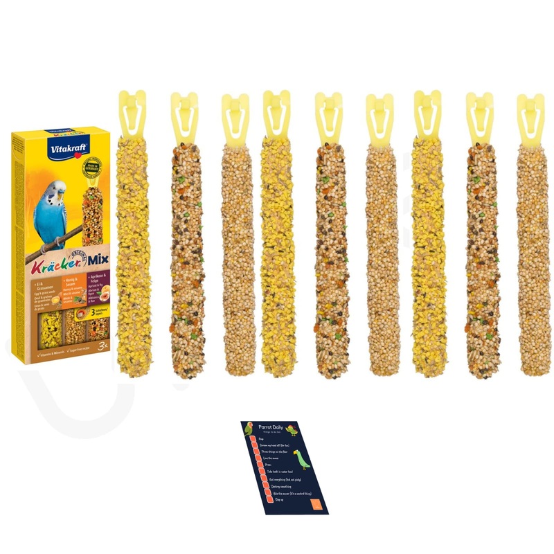 Bundle Vitakraft Budgies Crackers Trio-Mix including Egg Grass Seeds Apricot Fig Honey Sesame – Pack of 3 (9 sticks in total – 270g) with Info Card