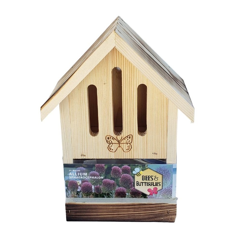 The house measures 10 inches x 5.75 inches x 4.75 inches. Planting Instructions: The smaller varieties of Allium should be planted 4″ deep and the larger varieties 7-8″ deep. Spacing 6-8″.Hardiness zones 4-8. The plant grows 12-36 inches tall. The flowers bloom in early to mid-summer. The flower heads are egg-shaped and reach a height of 1-3 inches. The butterfly house also includes 25 Sphaerocephalon Allium bulbs. This allium is also known as drumsticks. These pretty flowers open green, then start to turn a purple crimson color from the top creating an unusual two-tone drumstick flower head. In return for their hard work, you can provide them with a protective home with this 100 FSC-certified wooden butterfly house. Attract beautiful butterflies to your garden and they will help pollinate your garden flowers and plants.