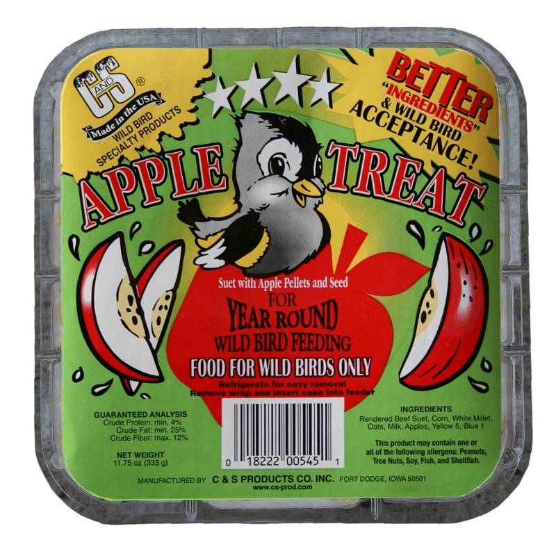 Apple Treat is produced by melting the highest quality beef fat; blending it with a variety of seeds and fruit which are then poured into our trays to harden. C&S's quality and special processes allow suet to be fed year round resulting in summer suet feed