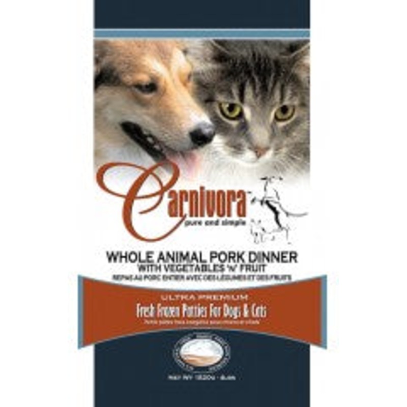 Finely ground whole pork carcass and a 5% veggie and fruit mix which includes finely ground romaine lettuce, bok choy, celery, carrots, apples, pears, blueberries.Pork patties contain the whole animal except the heads, hides, bladder and large intestine (m