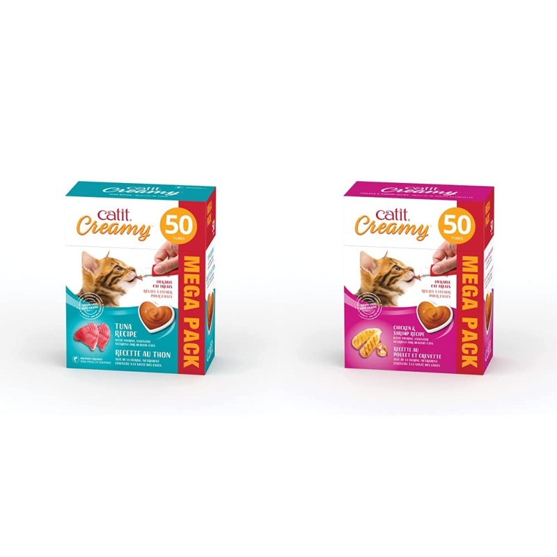 Catit Creamy Tuna Lickable Cat Treat – 50 Tubes – Mega Pack The Catit Creamy Lickable Cat Treat is a healthy and hydrating lickable treat, rich in amino acids. Serve in a cat dish or feed your cat directly from the tube as a special reward. Catit Creamy treats are natural, tasty and full of essential nutrients. Add some tasty variation to your cat’s diet with Catit Creamy treats – delicious by itself or as a cat dry food topping. Catit Creamy Chicken & Shrimp Lickable Cat Treat – 50 Tubes – Mega Pack The Catit Creamy Lickable Cat Treat is a healthy and hydrating lickable treat, rich in amino acids. Serve in a cat dish or feed your cat directly from the tube as a special reward. Catit Creamy treats are natural, tasty and full of essential nutrients. Add some tasty variation to your cat’s diet with Catit Creamy treats – delicious by itself or as a cat dry food topping.Hand-feed your cat or use as a savory topping for enhanced enjoyment. Flavor varieties include Tuna and Chicken & Shrimp for product1 and product2 respectively. Intended to supply your cats with additional nutrients in a delectable squeeze-up format. Each mega pack contains 50 tubes (15 grams each) of Tuna flavored treats and 50 tubes of Chicken & Shrimp flavored treats (total 100 tubes, 1500 grams). Rich, creamy flavor purees in lickable tubes for a fun and delicious cat treat; Serve directly, in a dish, or as a dry food topping.