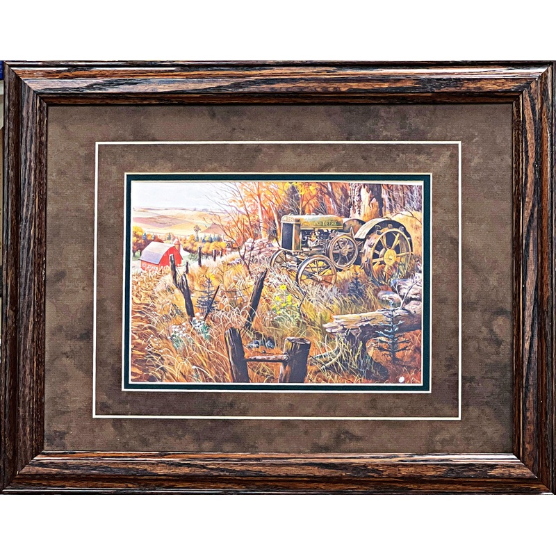 Vintage Artwork: This print captures a nostalgic scene of an old John Deere tractor resting in a field, with vibrant fall colors and rustic details.Framed Presentation: The artwork is professionally framed with a distressed wood frame, adding a rustic char