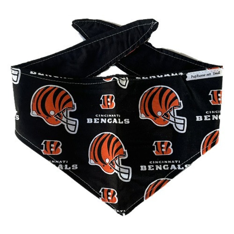 Cincinnati BengalsNFL Dog Bandana ScarfsBARK FOR YOUR TEAM!! Handmade cotton NFL team bandanas. The reverse fabric is a solid cotton fabric. Makes a great gift for any dog owner. Wear alone or with the teams jersey. This bandana is cut with a curve so it f
