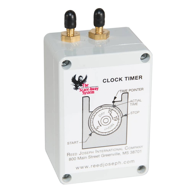The newest Clock Timer, which is battery operated, hasreplaced the earlier wind-up timer. It still does a superb job of activating and deactivating the Scare-AwayLP Gas Cannon automatically, but now no winding is necessary. It will operate for an entire se