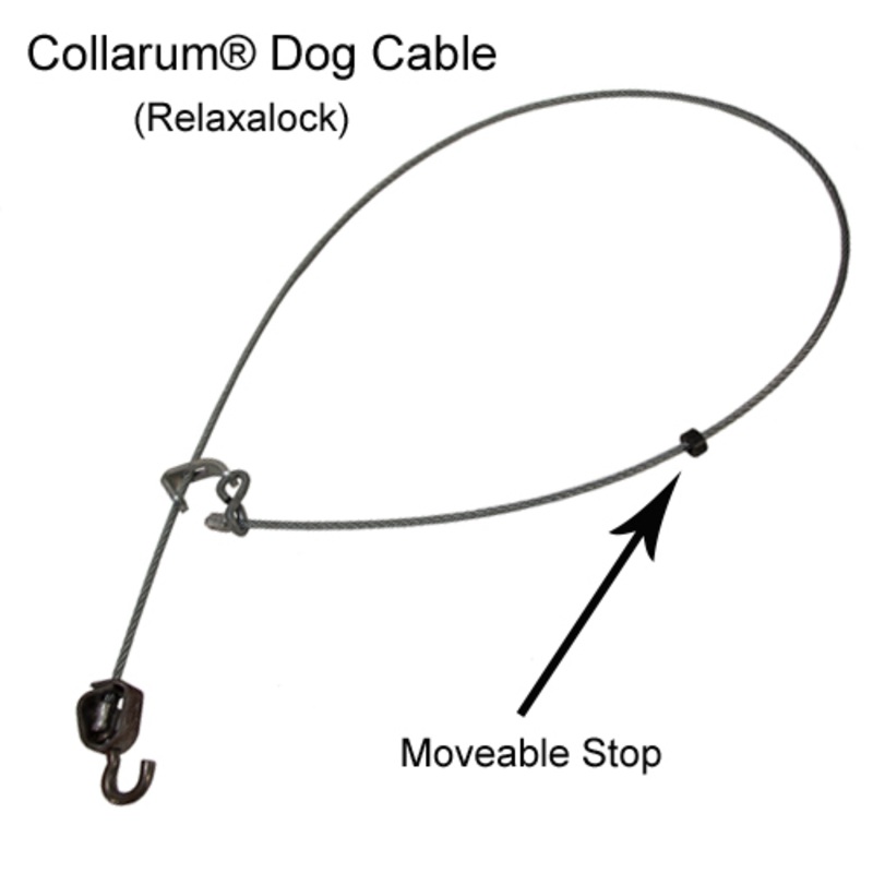 This Collarum replacement cable is 40" long and made from 3/16" galvanized aircraft cable. It includes a Relaxalock, a movable loop-stop, and a universal swivel with j-hook at its end for easy mounting to existing anchoring hardware.Brand:Wildlife Control