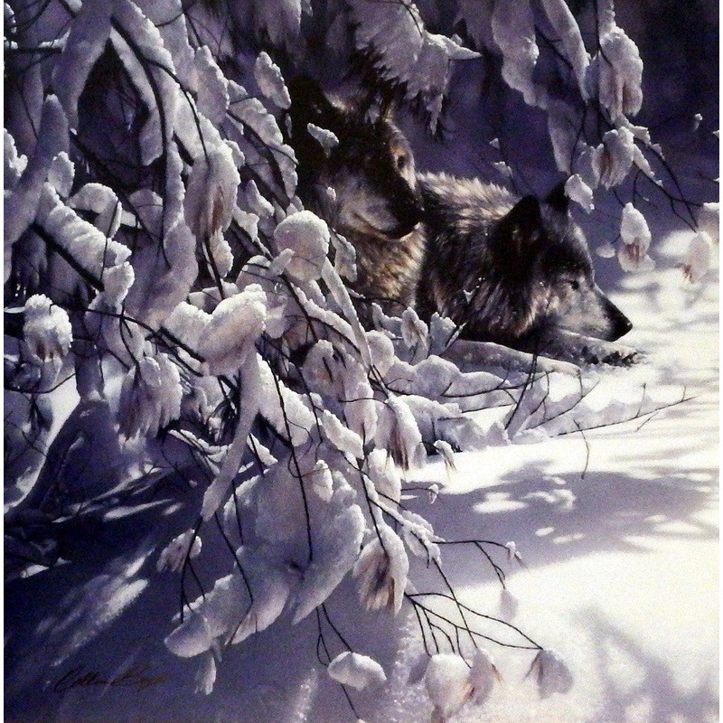 One Wolf looking out as the other sleepsImage Size 18"W x 18"HPaper Size 18"W x 18"H