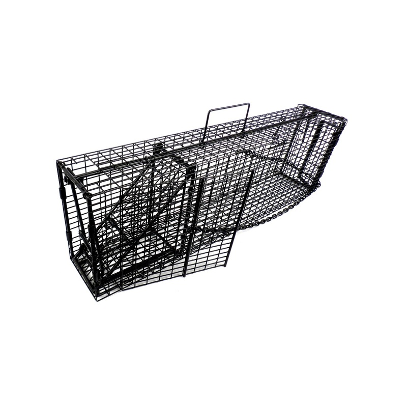 The Comstock Model Chimney is a trap designed to capture raccoons living in chimneys, to be dropped into a chimney from the top, and completely hidden from sight. It consists of the trap, trap flap, trap flap chain, trap stop, and chimney top mesh screen. The trap stop allows you to drop the trap into the chimney at any depth you prefer, the chimney top mesh screen will rest under the trap stop to prevent raccoons from entering the chimney and avoiding the trap. The trap flap will prevent raccoons from exiting the chimney and avoiding the trap. To save on shipping and space in transit, all the components fit nicely inside the trap until it is ready to be set. Once the trigger mechanism is set with the trap stop in place, the trap can be dropped into the chimney. Made light in weight and compact to be carried up ladders, this trap at 30 inches long weighs only 9 lbs.. This trap features a powered door that closes from the outside in rather than inside out. A stable trigger bar will withstand jarring, but when pulled by a raccoon, will fire easily. The lock-bar on the door will prevent escape.