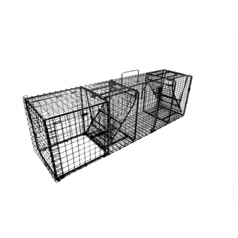 It features a built in 3-way nose cone for mounting over dens or entry points on structures. With two doors, this unique cage trap will capture animals coming from two directions in a trail situation. Utilizing a bottom opening in the nose cone, it will also capture animals entering or exiting dens, free standing, or up against structure.