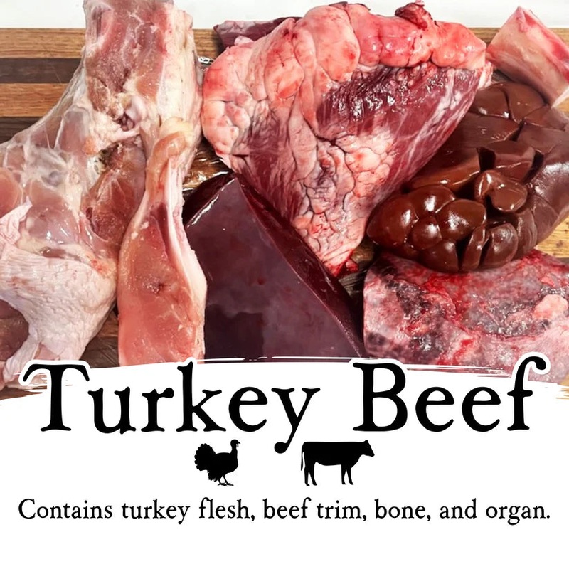Turkey, bone, tripe, andall the tender offal you can wish for for little poochy pie.43% turkey and bone22% beef19% tripe5% liver1.8% spleen4.9% lung2.5% heart1.8% kidney