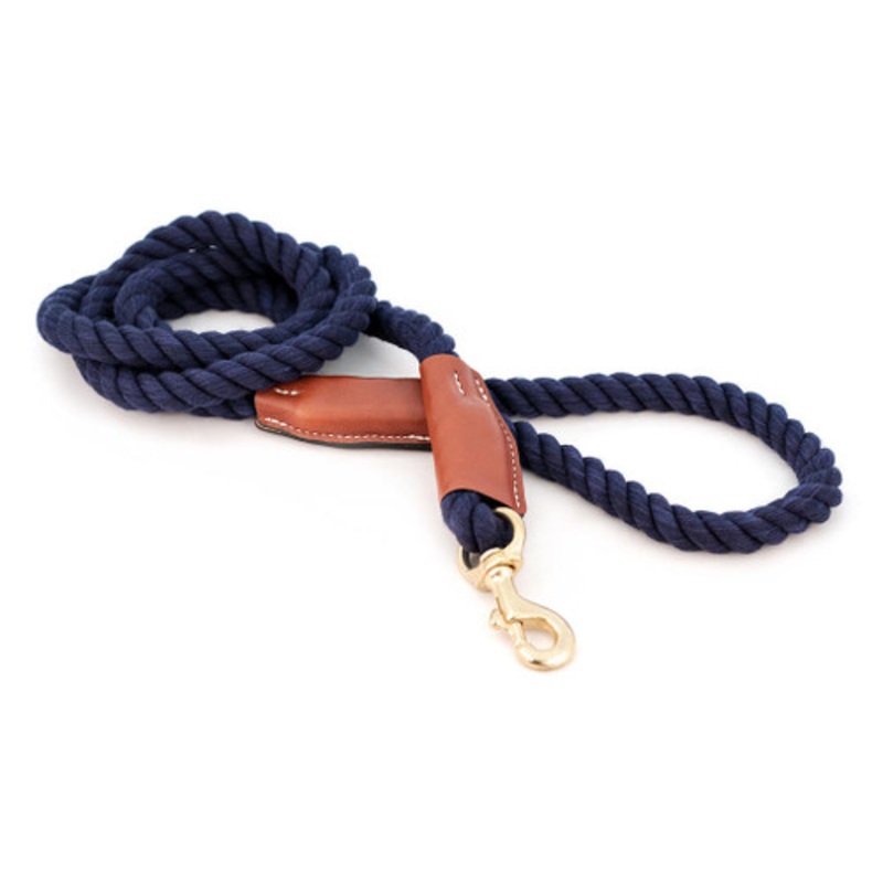 Cotton Rope Slip Leash with Leather Accents -Navy Blue- SnapOur Natural Cotton and Leather Leash is strong, soft, and comfortable. We use USA-grown and -produced cotton rope with genuine Wickett & Craig chestnut bridle leather and a solid brass snap, makin