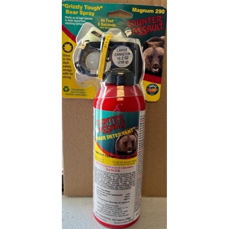 Counter Assault Bear Spray offers an optimal combination of spray time and distance, this bear deterrent pepper spray deploys a high-volume, atomized blast of concentrated spray to deter a bear attack. Available in two sizes 8.1 ounces (230 grams) & 10.2 o