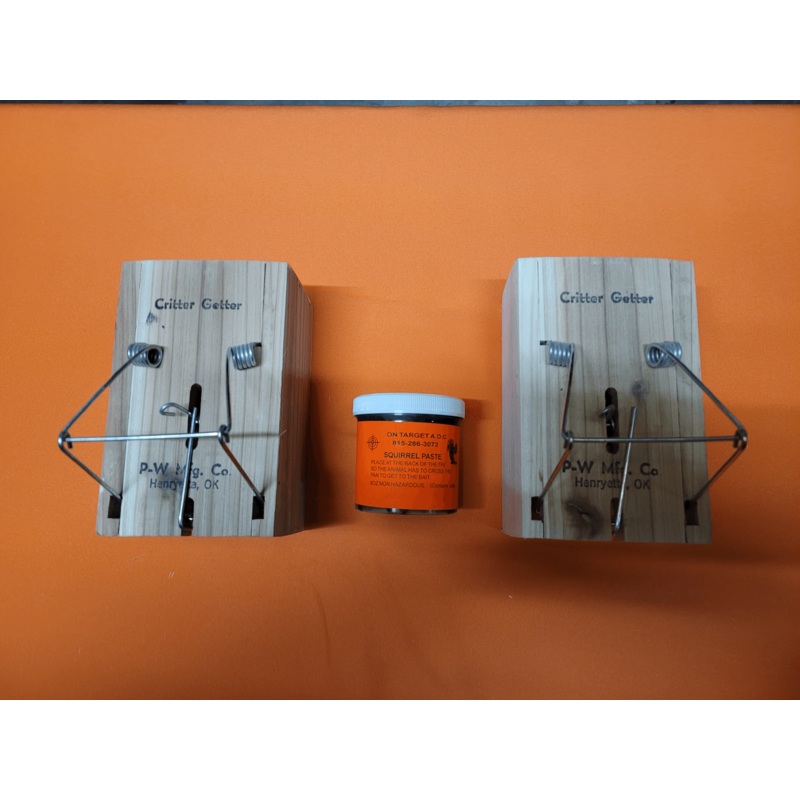 Free shipping to the lower 48 states.Box style wooden snap trap that is great for squirrels, rats, chipmunks and other medium-sized rodents. These two traps come with squirrel paste bait (place 1/2-1 teaspooon of bait on interior back of trap for best resu