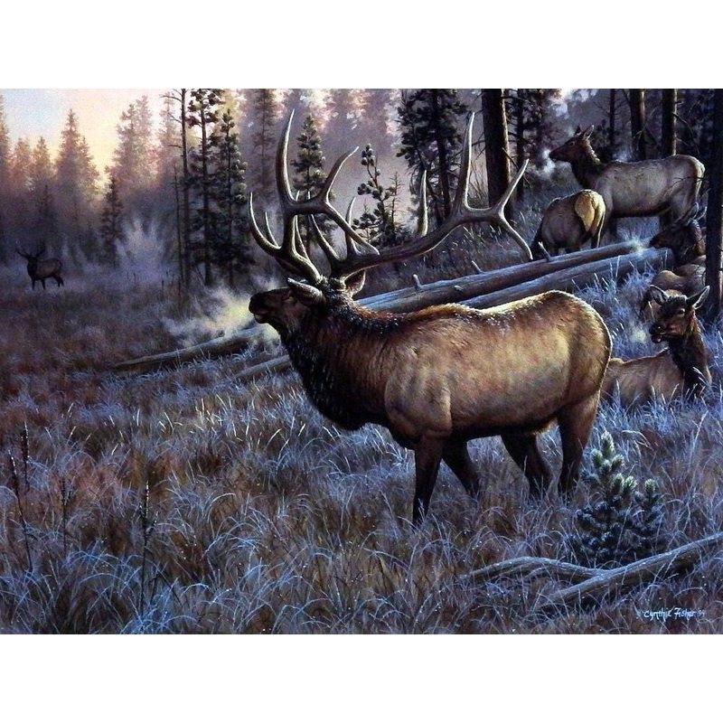 In Cynthie Fisher’s elk painting A WORTHY OPPONENT a big bull prepares to defend his harem from another approachingmale. Bull elk will stay in an all male herd untilthe fall rut. At that time they go off by themselves to gather a group of cows for breeding. The bull elk will protect his harem from challenging bulls even to the death if necessary. During the rut the male elk will get almost no sleep as he has to spend his time chasing off or battling other bulls.