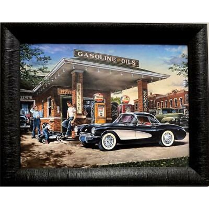 Print is framed and hand textured without glass to give it the look and feel of a canvasFramed Size 19 x 15Ready to HangDan Hatala Full Service Corvette Gas Station Print Framed 19 x 15DescriptionPrint is framed and hand textured without glass to give it t