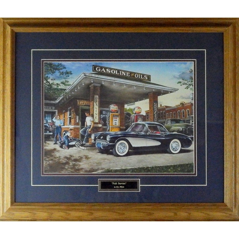 Great Old classic gas station scene with the corvette sitting at the pump while the boys talk carsFramed Size 25"W x 21"H