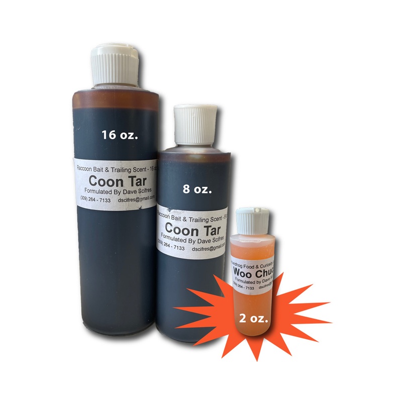 Get 2 Coon Tar bait bottles, Get 1 2 oz.Woo Chuck bait bottle for FREE!