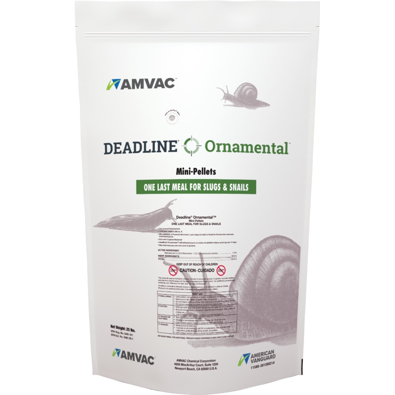 DEADLINE Ornamental Snail Bait is a molluscicide containing four percent metaldehyde labeled specifically for use in landscapes, ornamentals, ground covers and lawns. DEADLINE Ornamental is formulated into mini-pellets that are rain fast, and can withstand