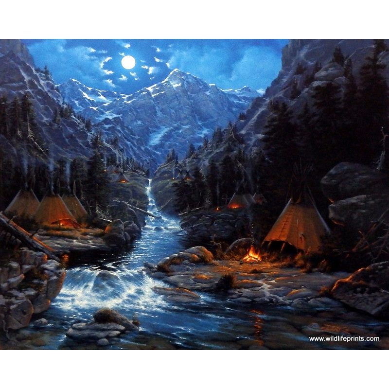 An Indian village of teepees sits alongside a fast moving mountain stream in Derk Hansen's print Hunter's Moon. Tipi's (also teepees) were preferred by the Plains Tribesdue to their flexibility and portability. They were easy to take down and reassemble as