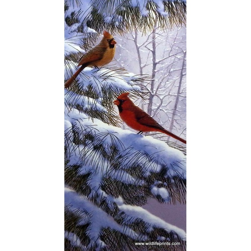 A pair of cardinals provide a brilliant contrast to the winter snow in the Derk Hansen wildlife print Winter's Song. Cardinals do not migrate and do not molt, so they provide that bright cheerful color to northern states all year long.Available in two open