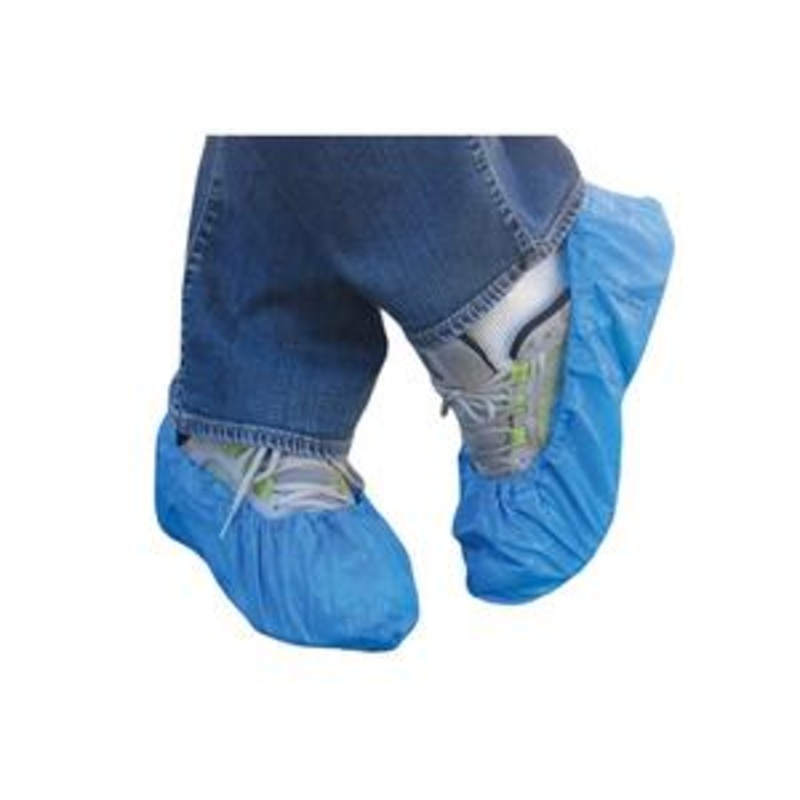 Shoe Cover fastens at the ankle with an elastic band. It is 16 inches in length, fitting over large sized shoes, and is blue in color. This shoe cover is made from Polyethylene coated nylon and offers great protection from a wide range of chemicals, animal