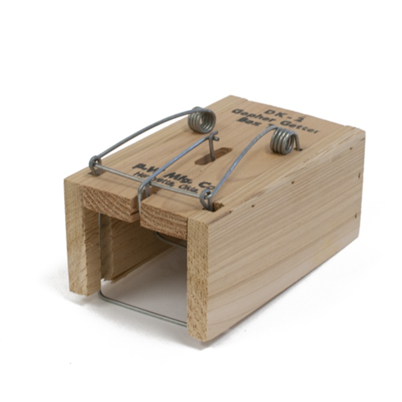 Gopher Getter Gopher Trap: this is the premium grade DK-2 Wood Box Gopher Trap from P-WManufacturing. Find a fresh mound and dig open the tunnel entrance. Place trap flush to the tunnel opening. Pack loose dirt around the base of the trap. Be sure to leave