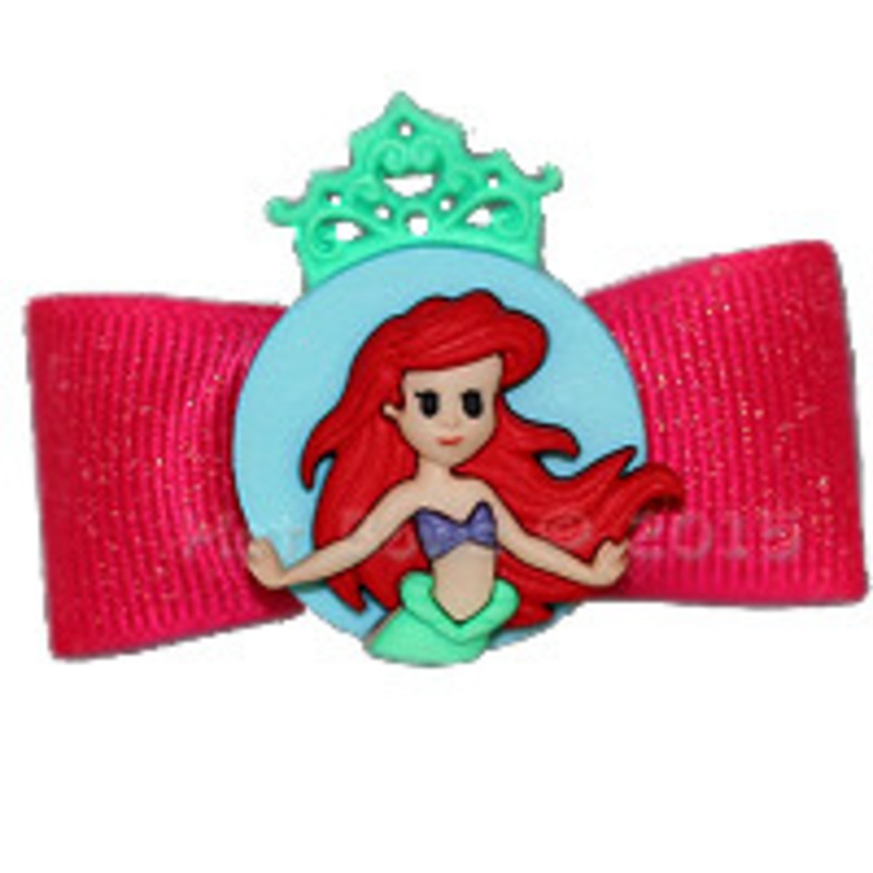 Dog Bow Barrette -Its ArielThe most beautiful mermaid in all the oceans! The hot pink ribbon has little tiny gold glitter dust. Approximately 2-1/4 wide; stiffened for extended wear; ribbon 7/8. This is one of our larger hair barrettes not recommended for