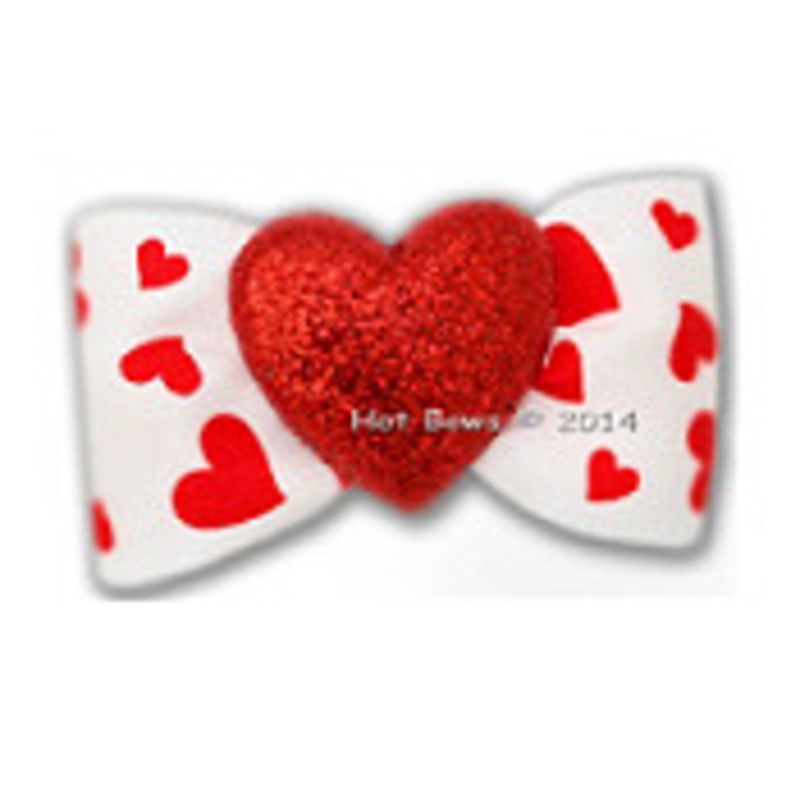 Dog Bow Barrette - True LoveA large glittery red heart in the center on a white ribbon adorn with red hearts. The perfect way to say "I LOVE YOU" always. Stiffened for extended wear; approx. 1.75" wide; ribbon 7/8" wide. Great for everyday or Valentines Da
