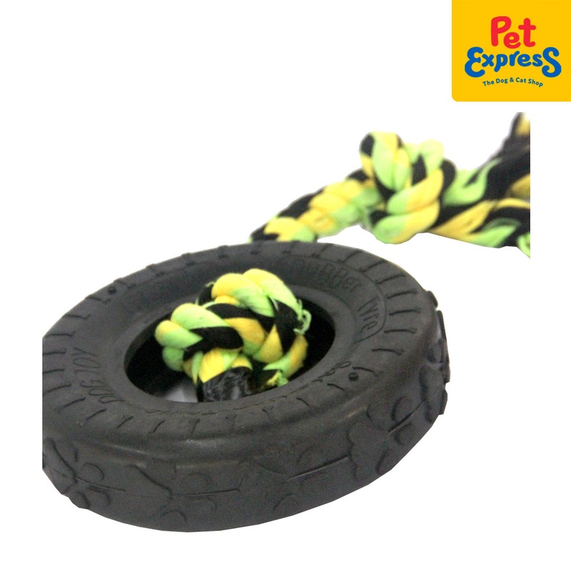 Doggo Tough Tire Dog ToyMade of thick and non-toxic rubberSmall Length: 3.5 inches Width: 3.5 inches Height: 1.5 inchesMedium Length: 5.5 inches Width: 5.5 inches Height: 1.5 inchesLarge Length: 7 inches Width: 7 inches Height: 1.75 inchesPaw-fectly Made!