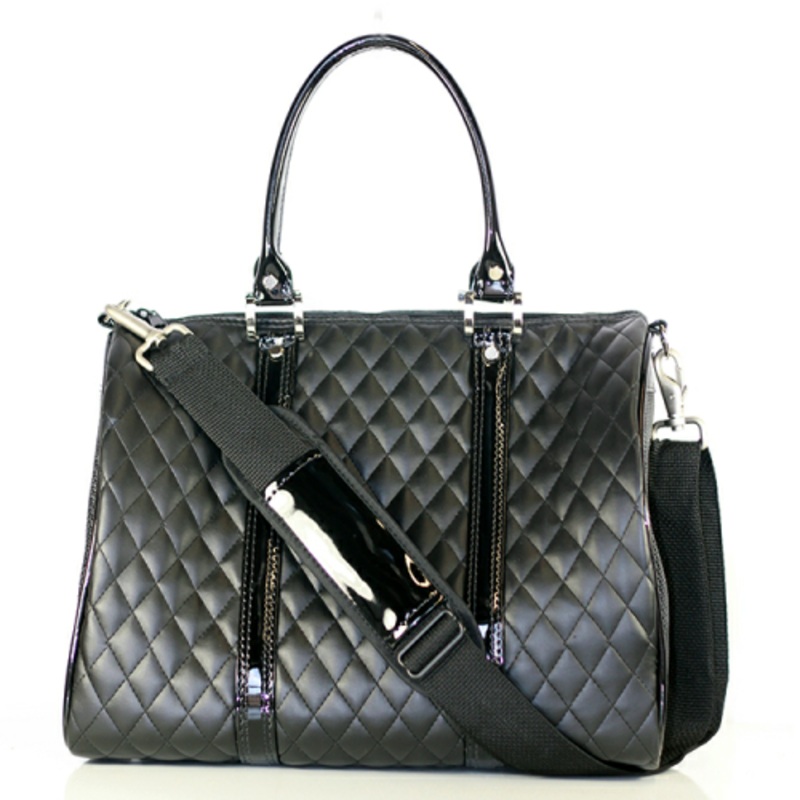 Duffel Black Quilted Luxe Pet Dog Carrier by PetoteOur JL Duffel is already a tail-wagging best-seller at Petote! Crafted from stylish black quilted faux leather with shiny black trim, this bag is lightweight, roomy, and oh-so-stylish! Perfect for pups up