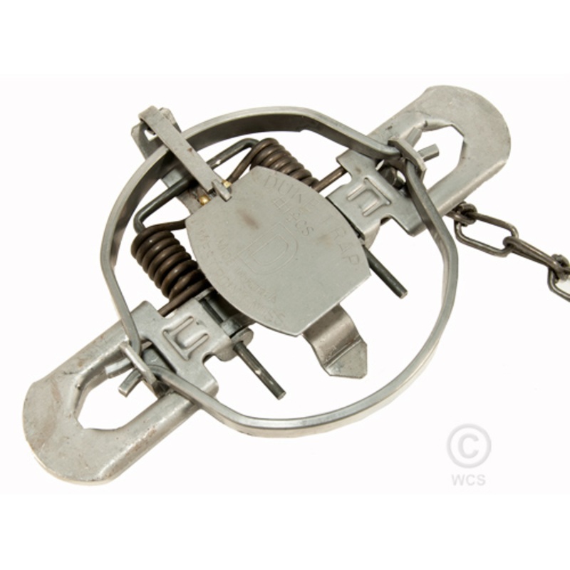 Duke #1 3/4 Standard Jaw, Double Coil: Levers rise high on the jaws to ensure positive locking. Adjustable pan tension with a #10 brass nut & bolt assembly. Universal swivel at the end of the 6" 2-0 double loop chain. Great for capturingBobcat, Coyote, Fox