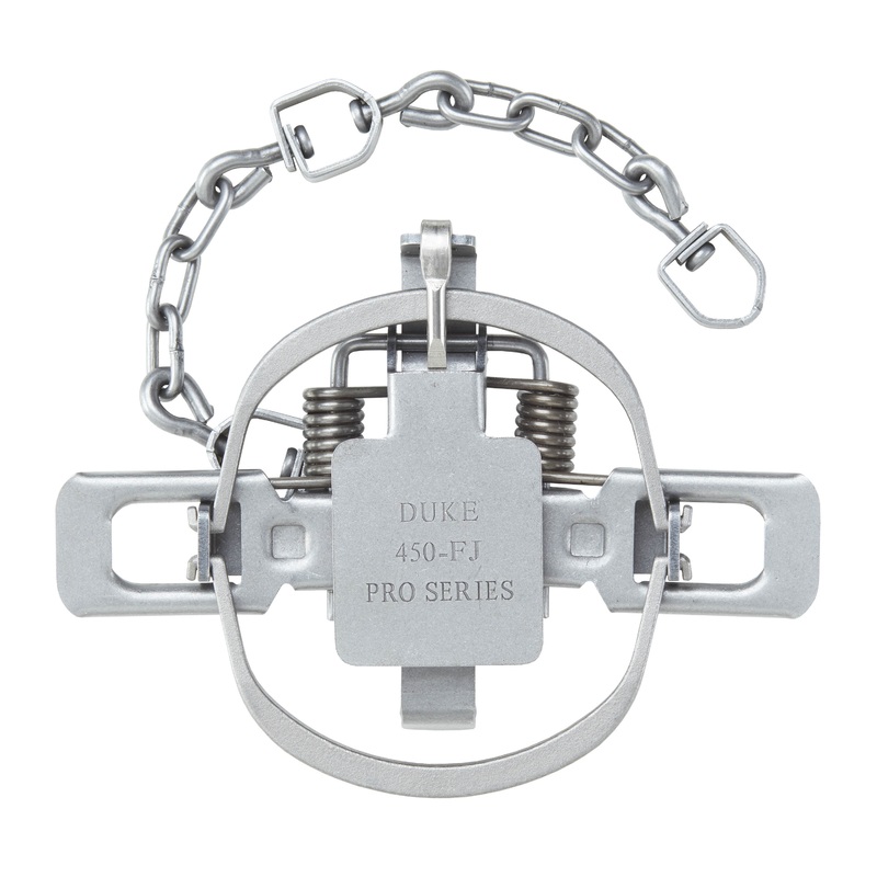 The Duke Pro Series 450 FJ features heavy cast steel full closed jaws, stainless steel rod dog with step down PIT pan system, double base plate, center swiveled D-Ring with machine link chain, in-line swivel & mid chain swivel.Designed for serious fox trap