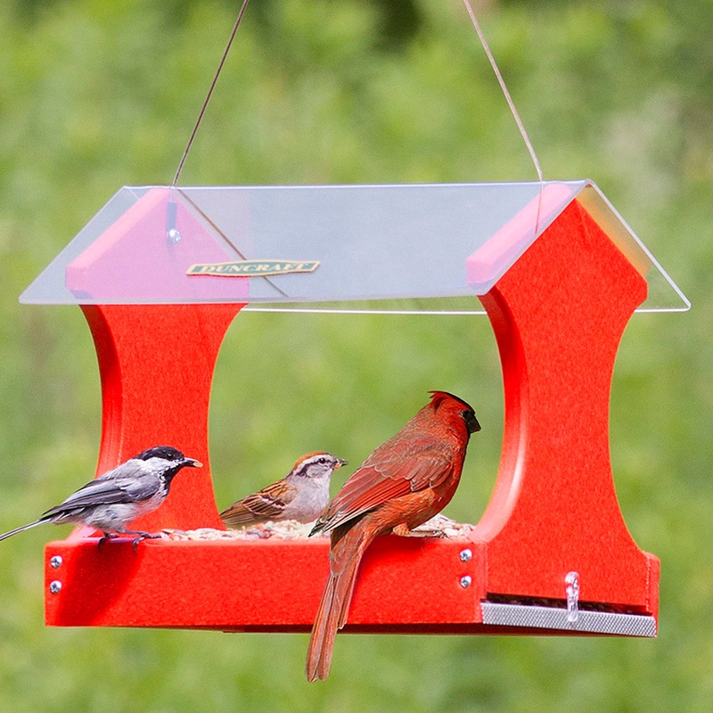 Enjoy watching your new friends through a transparent roof! Serve rich foods birds love, like fruit, seed, or suet nuggets and pellets. Perforated aluminum tray provides excellent drainage and slides out for easy cleaning. Crafted from non-porous red recycled plastic. Tray measures 1-1/4 inches deep. 10-1/4 x 11 x 9 inches. Made in the USA.