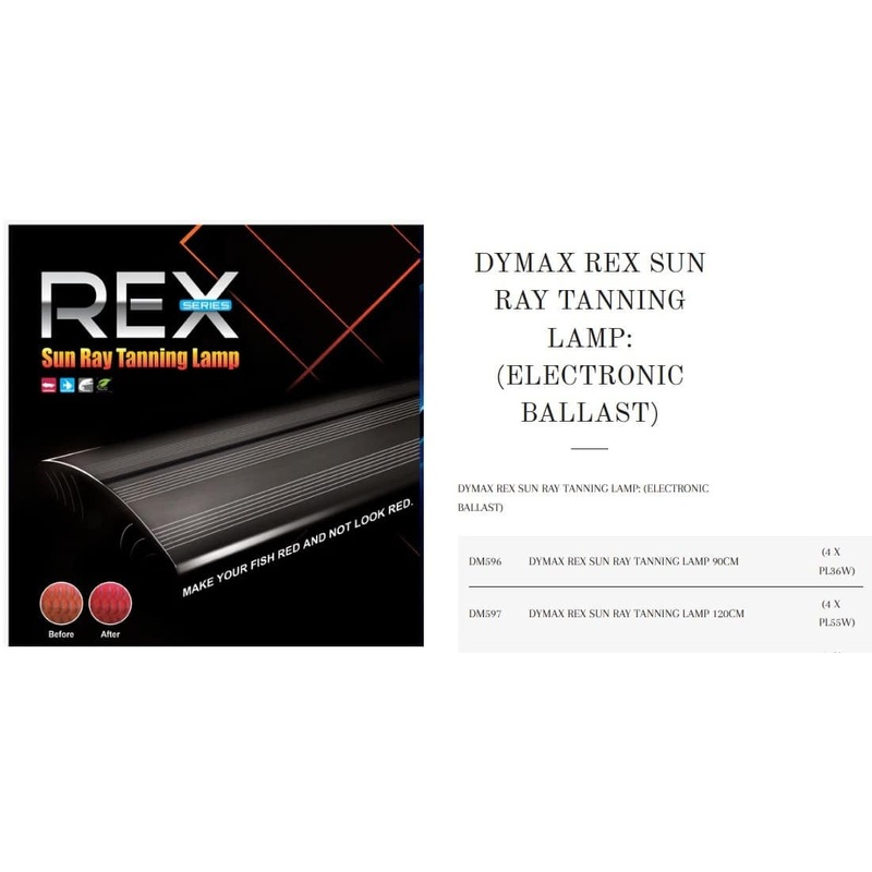 DYMAX REX SUN RAY TANNING LAMP 120CMDymax Sun Ray Tanning Lamp projects ultra violet light that is used to evoke the melanin production of melanocyte cells on the scales. Unlike many other tanning lamps in the market that claim to be the best (especially t