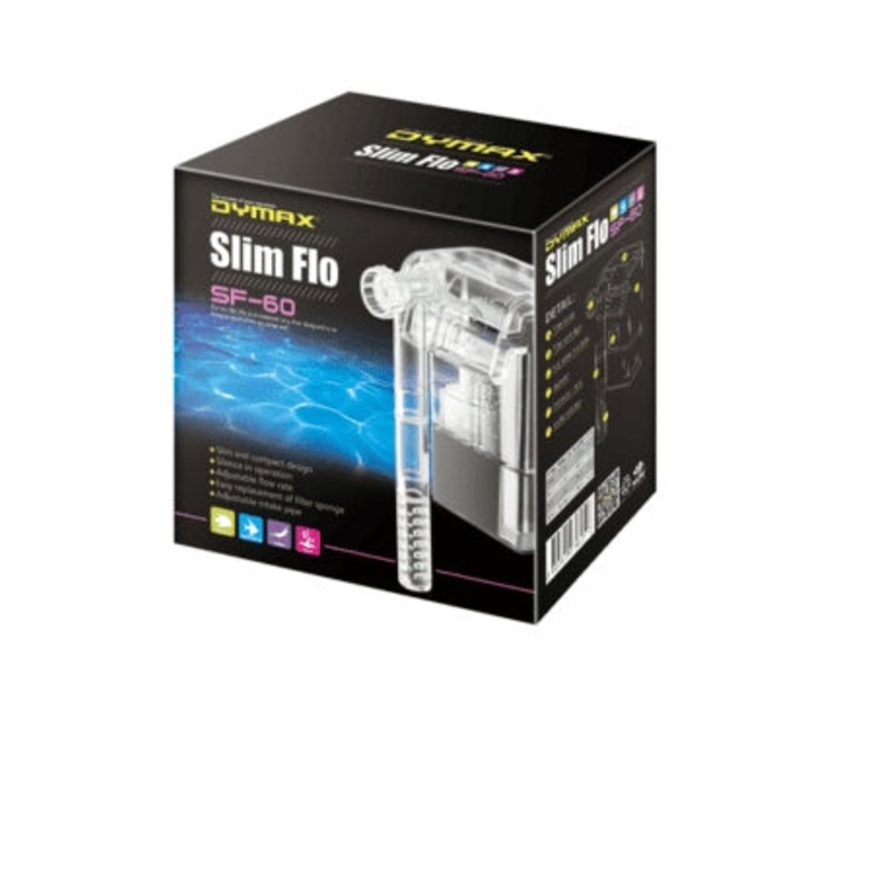 DYMAX SLIM FLO SF-60Dymax Slim Flow is an external hang-on filter designed to be clipped on any side of the aquarium. Unlike the conventional internal power head filter this hang filter does not take up space in the aquarium. The cascading effect provides