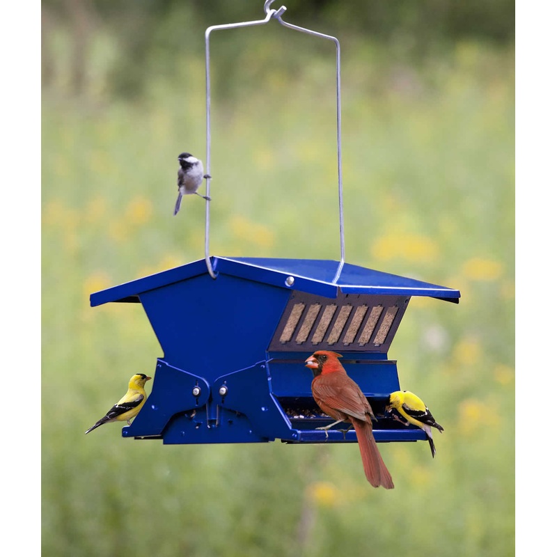 Based on years of positive feedback, customers prefer this squirrel-resistant, metal feeder for standing strong in the face of squirrels. Each weight-activated perch shuts off the seed supply at the touch of a squirrels weight. Includes two mounting options: hang or pole-mount. This is a 1 inch round sectional pole with a plastic mounting bracket and plastic ground socket. Pole stands 58 inches tall before insertion into the ground. All-steel with blue finish and locking roof. 11 x 14 x 9 inches.