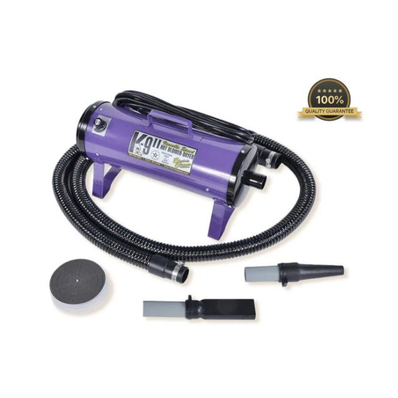 The K-9 II Dog Dryer is a lightweight, portable dog dryer. This variable-speed dryer adjusts from 0 to 240 CFM (cubic feet of air per minute) for the ultimate in pet drying versatility. You’ll love the balance of low noise, high power, and the dog’s coat protection. The K-9 II Dog Dryer is the go to dog dryer of choice for professional groomers everywhere.