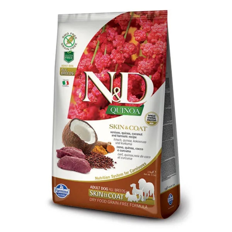 Farmina N&D Quinoa Functional Canine Dog Food – Skin & Coat VenisonRecipeuses94% fresh grass-fed venison with coconut, turmeric and quinoa, all rich in essential vitamins, minerals and antioxidants like zinc, copper, Vitamin B, Omega-3 fatty acids, magnesium and more. All essential components to help boost the immune system and encourage healthy looking skin and coat. This limitedingredient recipe is perfect for dogs who are sensitive to other protein sources and is a balanced and complete meal for adult dogs of all shapes and sizes.