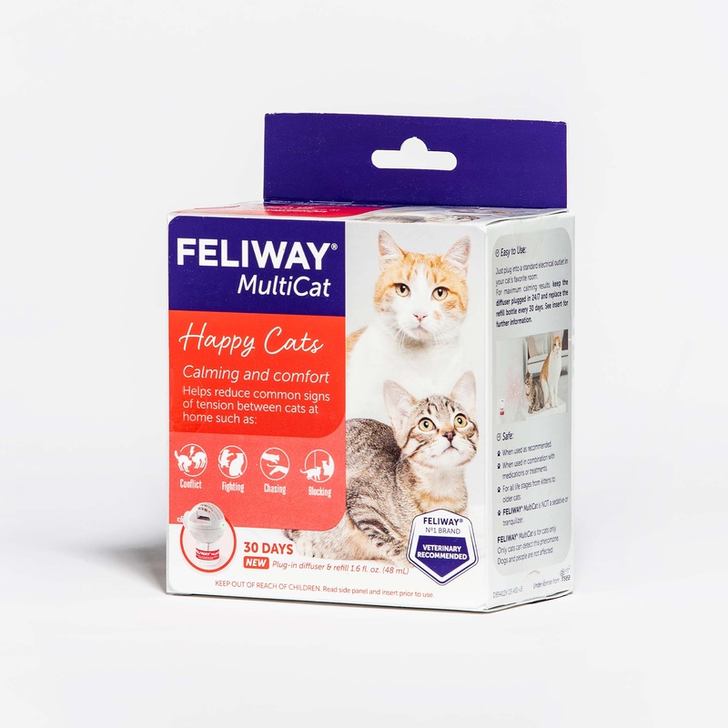 Feliway is a synthetic pheromone used to help your cat feel more relaxed at home. Pheromones are a type of chemical communication that all cats use to interact with each other and the world around them. These natural chemical messages are released from special glands around their bodies and are very safe. People and other animals are not affected by cat pheromones. Feliway MultiCat mimics the natural cat appeasing pheromones and it eases tensions by sending harmony messages to cats. These ‘harmony messages’ reduce issues such as fighting, hissing, chasing and other tensions.
