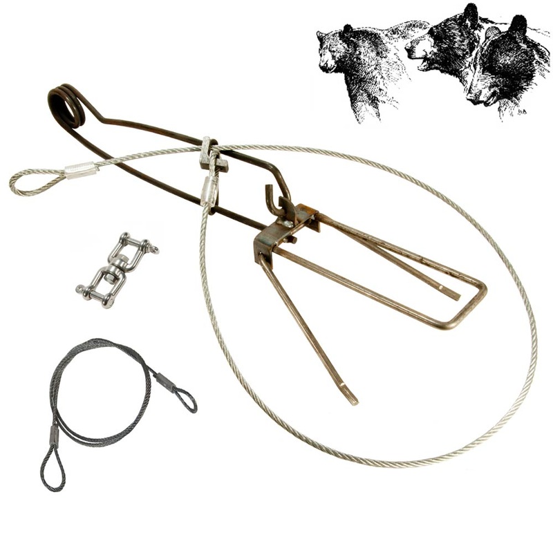 TheFremont Bear Foot Snare, which comes complete with the spring-loaded throwing mechanism, one (1) bear foot snare cable (as shown), one (1) 5 ft. high tie cable for anchoring the snare cable, and one (1) Stainless Steel swivel for easily detaching and replacing the snare cable after a capture is made.